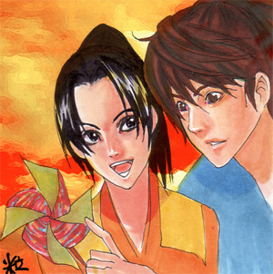 きり丸の左手と供にぶらぶらと宙を泳いでいるかざぐるまを言うと、きり丸は歩きながらそれを自分よりも少し高く、半助に見えるようにかざしてから、右手で鮮やかな紙の端をつまんでみせる。半助も体を傾けてきり丸の肩から覗いた。