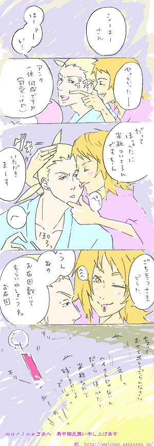 7:ほっぺたに米粒なんて、どーしてそういう誘い方しかできんのかね 8:べつに誘ってたわけじゃあ無いんですけど 7:嘘つきなさい 8:やー、ばれてたとは! 7:白々しいねぇ