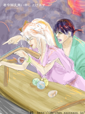 リクの内容が、男前でラブラブな二人とのことだったのですが…なんだこれは。男前がひとつも表現されていません。ははは。(乾) 犬は尻を触られたって平気です、慣れてます。ただ邪魔なだけです(ひどい) ラブラブというのはアレということで。うちの弥勒と犬夜叉は普段一緒に行動しないというカップルなので、一緒に縁日に来てるだけで精一杯ラブラブということで…(おい)